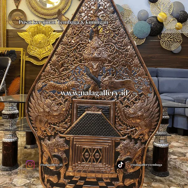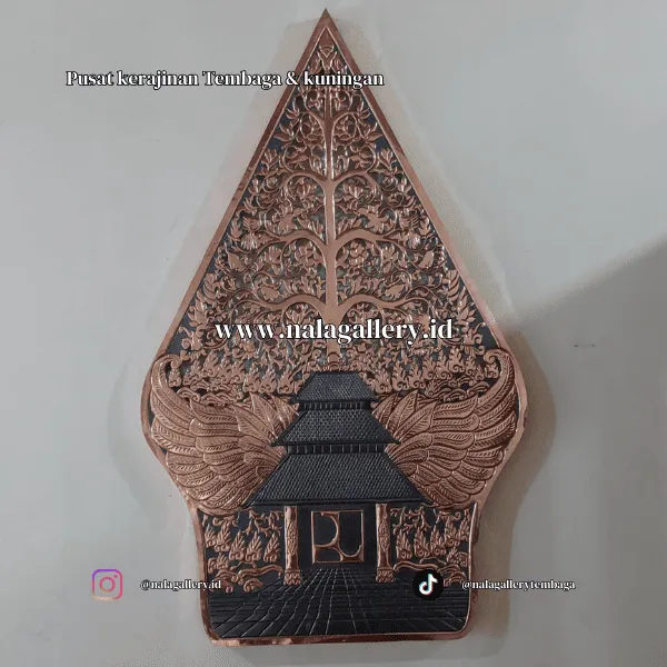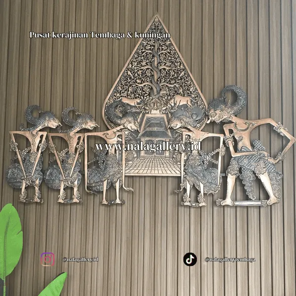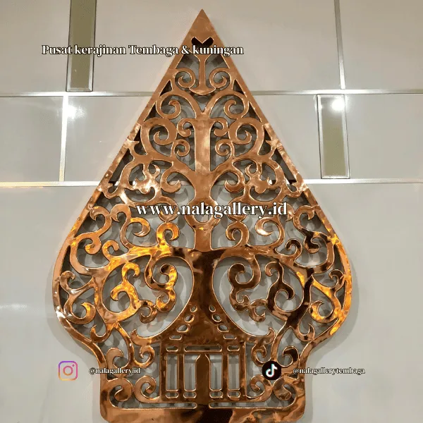 Gunungan wayang berbahan tembaga ini membawa suasana Jawa yang hangat dan penuh makna. Bentuknya ikonik dan mudah dikenali, cocok sebagai dekorasi yang tidak hanya enak dipandang tetapi juga punya nilai filosofi. Ketika dilihat dari dekat, permukaan tembaganya memberi kesan kokoh, berisi, dan hidup. Warnanya yang khas membuat ruang terasa lebih karakter, baik dipasang di ruang tamu, hall hotel, ruang kerja, galeri, maupun sudut rumah yang ingin diberi sentuhan budaya.