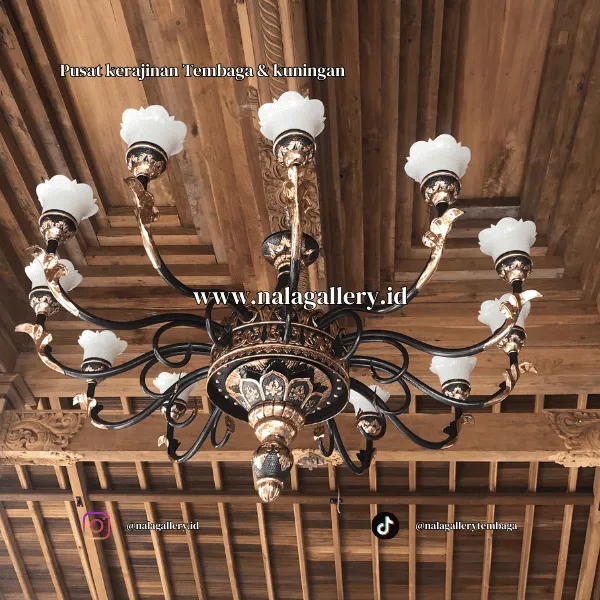 Lampu Joglo dari tembaga ini memiliki keunikan tersendiri. Desainnya meniru atap joglo yang bertingkat dan simetris, dengan ukiran halus di setiap sisinya. Saat lampu dinyalakan, cahaya hangat terpantul dari permukaannya, membuat ruangan langsung terasa nyaman dan hangat. Lampu ini bukan sekedar untuk bersantai, tapi juga jadi perhatian yang membuat ruang tamu, ruang makan, lobi hotel, atau area pusat komersial terasa lebih berkarakter, sambil tetap memancarkan sentuhan seni dan budaya Jawa yang asli.
