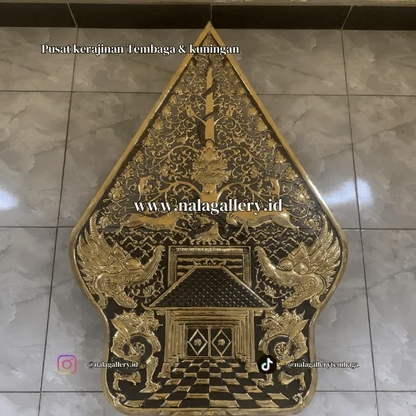 Gunungan wayang berbahan tembaga ini membawa suasana Jawa yang hangat dan penuh makna. Bentuknya ikonik dan mudah dikenali, cocok sebagai dekorasi yang tidak hanya enak dipandang tetapi juga punya nilai filosofi. Ketika dilihat dari dekat, permukaan tembaganya memberi kesan kokoh, berisi, dan hidup. Warnanya yang khas membuat ruang terasa lebih karakter, baik dipasang di ruang tamu, hall hotel, ruang kerja, galeri, maupun sudut rumah yang ingin diberi sentuhan budaya.