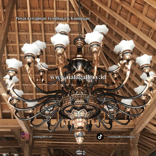 Lampu Joglo dari tembaga ini memiliki keunikan tersendiri. Desainnya meniru atap joglo yang bertingkat dan simetris, dengan ukiran halus di setiap sisinya. Saat lampu dinyalakan, cahaya hangat terpantul dari permukaannya, membuat ruangan langsung terasa nyaman dan hangat. Lampu ini bukan sekedar untuk bersantai, tapi juga jadi perhatian yang membuat ruang tamu, ruang makan, lobi hotel, atau area pusat komersial terasa lebih berkarakter, sambil tetap memancarkan sentuhan seni dan budaya Jawa yang asli.